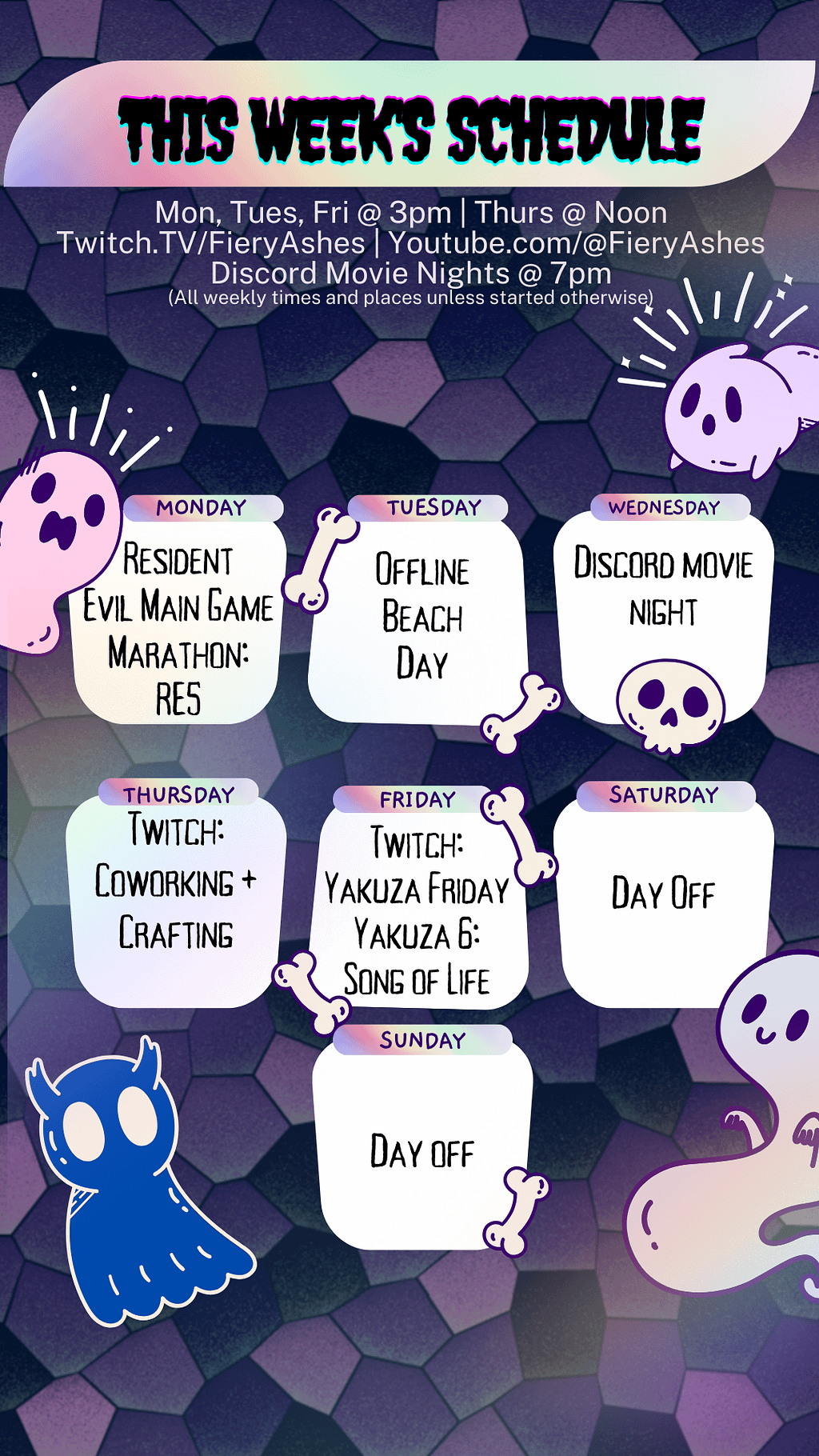 Always remember to check the Twitch schedule page on my channel! But generally you'll find me posting schedule images like these on socials, on my Discord, etc. because it's important to me to balance a schedule with the flexibility week to week for special projects, my disabilities, deliverables, etc.